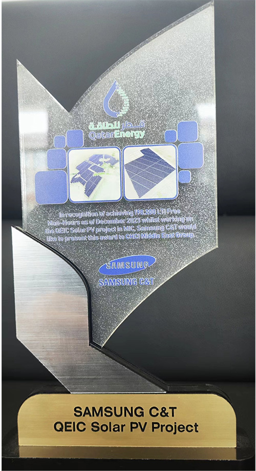 我公司收到卡塔爾能源875.5MW光伏發(fā)電項目業(yè)主方卡塔爾能源和總包方三星C&T公司聯(lián)合頒發(fā)的獎杯和推薦信。業(yè)主及總包方高度認可我公司項目履約能力,贊揚我司對該項目成功交付做出重大貢獻,表示愿意與我司建立長期合作關系?;谖宜咀吭降穆募s表現(xiàn),三星C&T公司授予我司推薦信。