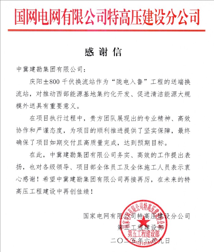 2025年6月9日,在±800千伏隴東-山東特高壓直流工程(簡稱“隴電入魯”)正式投運(yùn)之際,我公司收到國家電網(wǎng)有限公司特高壓建設(shè)分公司對慶陽±800千伏換流站項目發(fā)來的感謝信。信中高度贊揚(yáng)了我公司在項目執(zhí)行過程中展現(xiàn)出的卓越專業(yè)精神、高效協(xié)作能力和嚴(yán)謹(jǐn)工作態(tài)度。