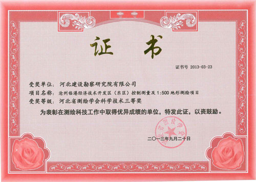 近日,由工程測量公司完成的滄州臨港經(jīng)濟(jì)技術(shù)開發(fā)區(qū)(東區(qū))控制測量及1:500地形測繪項目,被河北省測繪學(xué)會評為河北省測繪學(xué)會科學(xué)技術(shù)三等獎。